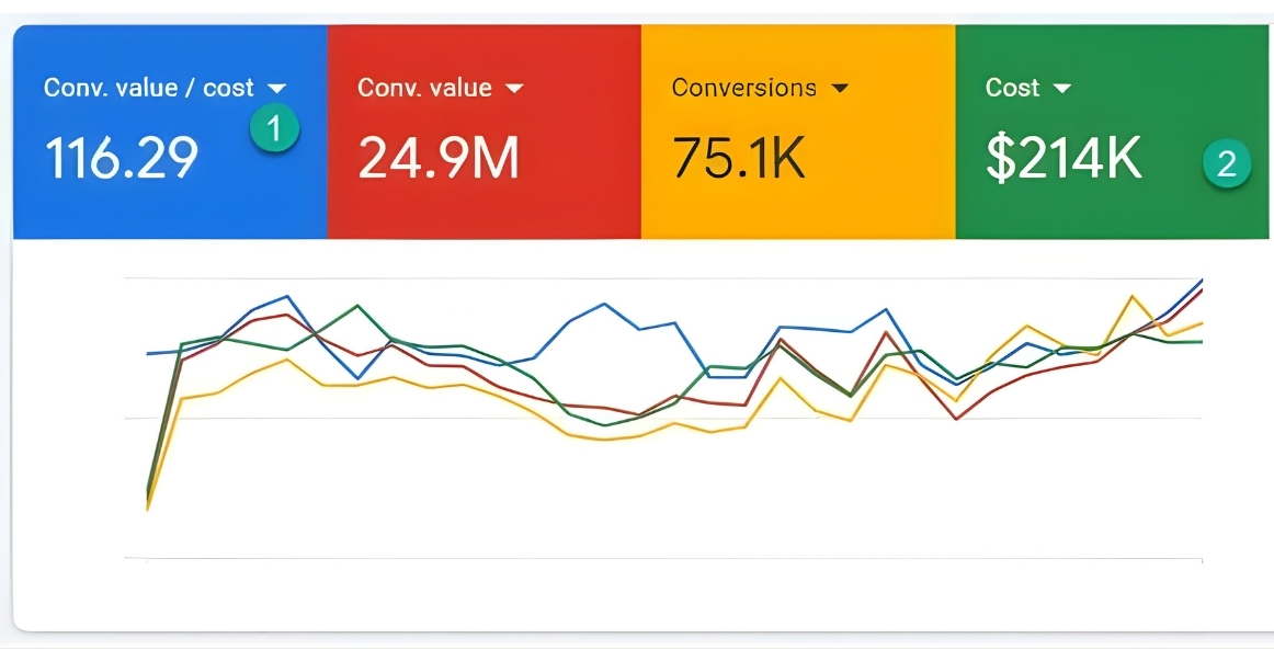 The campaigns delivered 75.1K total conversions with a strong conversion value / cost ratio of 116.29. With a total conversion value of 24.9M against a $214K ad spend.