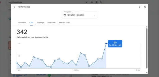 Local improvements and on profile CTAs generated 342 calls from the business profile during the reporting period. Call activity peaked at 50 calls in one day , demonstrating clear spikes in high-intent demand. These calls translated into qualified consultation requests and bookings.