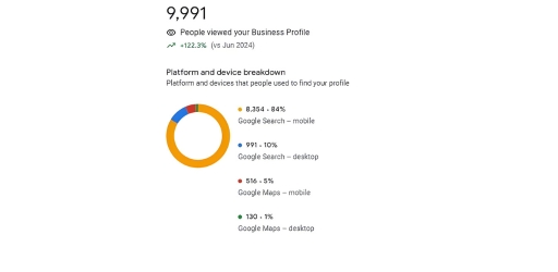 Around 8,354 views came from Google Search on mobile, making it the primary source of discovery. This highlights the importance of a strong mobile-friendly presence for capturing local clients.